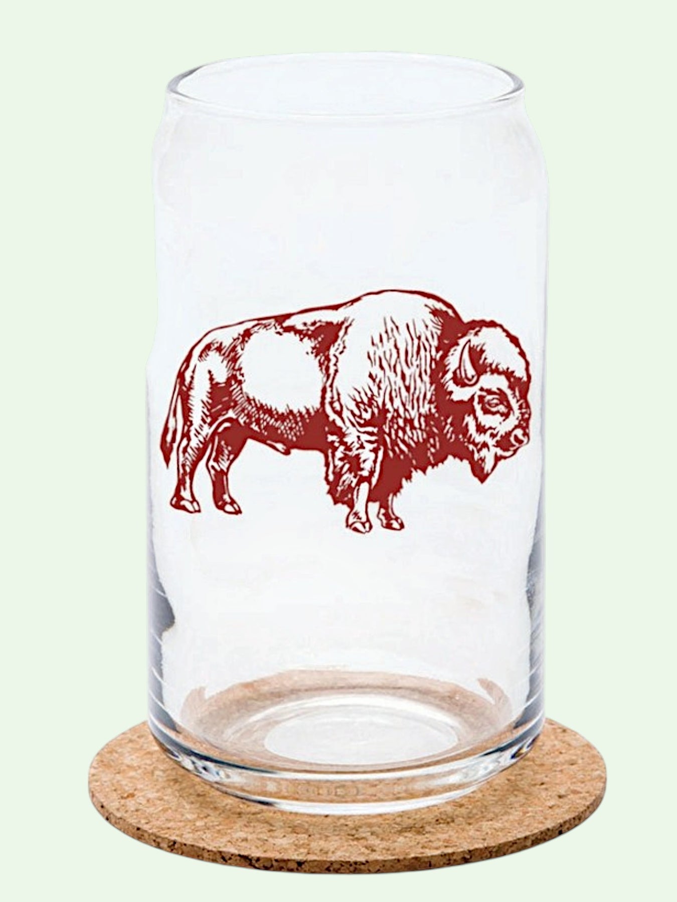 The bison can glass is clever and fun. This 16 oz can shaped glass is a nod to a classic soda and beer cans. Printed buffalo decoration.