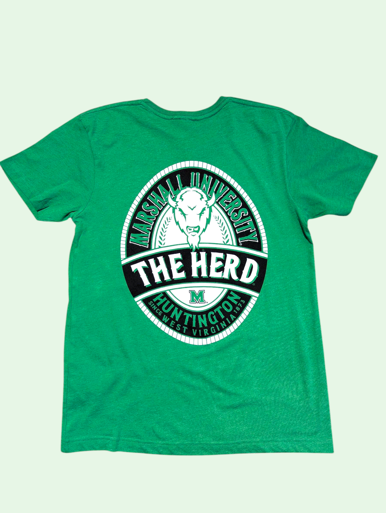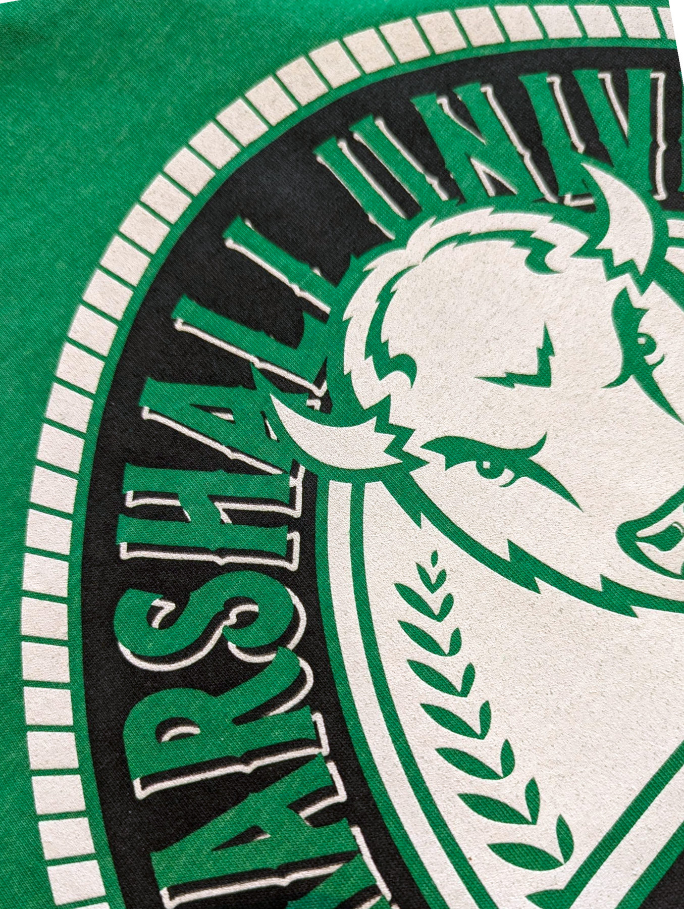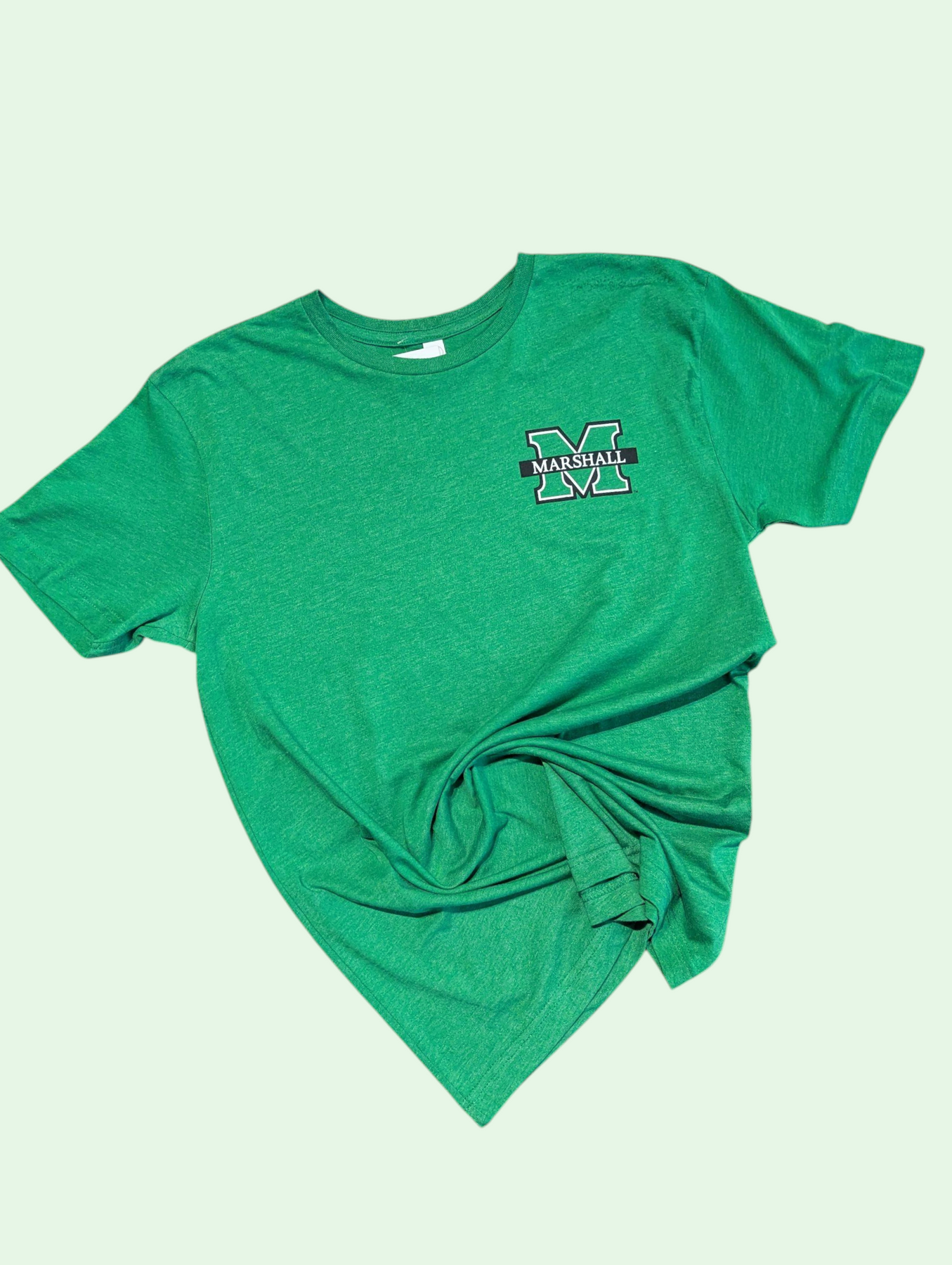 This tee is meant for the bold! With a basic Marshall mark on the front, all the action is on the back where the eye-catching design is the star. On a unisex 60/40 cotton/poly tee. Screenprinted.